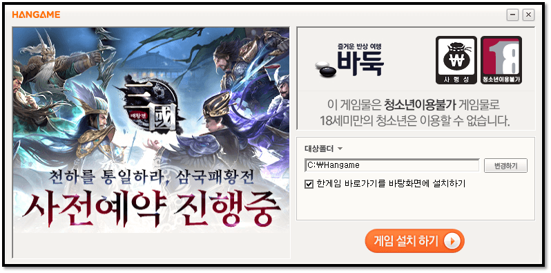 만약, 아이디가 없다면 별도로 회원가입을 해야 하고요. 어렵지 않게 새로 아이디를 생성한 다음 설치를 진행할 수 있습니다. 저는 한게임 바로가기를 바탕 화면에 설치하기 옵션을 선택 후 설치를 완료했습니다.