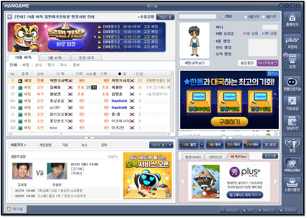 설치를 완료하게 되면 아래처럼 대기실이 나타나게 됩니다. 여기서 기보를 보거나 19줄 또는 9줄 매칭을 통한 대국을 둘 수도 있고요. 한돌 인공지능과 1:1로 붙어보는 것도 가능해요. 물론 다른 사람이 두고 있는 방에 입장해서 실시간으로 관전도 가능하니 잘 둘러보세요.