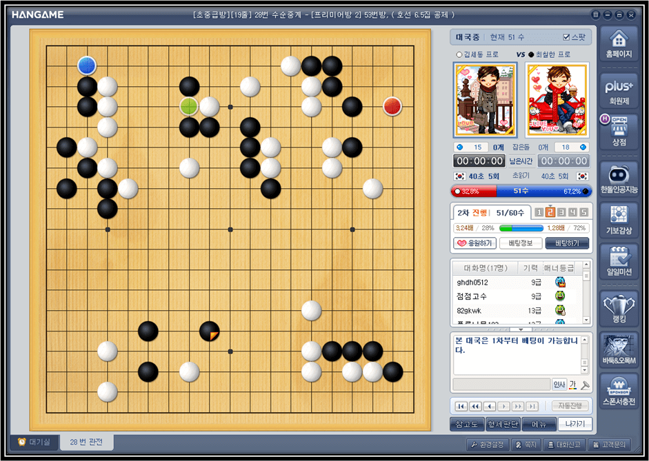 저는 김세동 프로와 최철한 프로가 진행 중인 경기 방에 입장해서 실시간 바둑 대국을 관전해 보았습니다. 내가 직접 다른 사람과 두는 것도 좋지만 프로 기사님이나 실력이 훌륭한 사람이 두는 대국을 실시간으로 보면 분명 바둑 실력을 빠르게 늘릴 수 있다고 생각합니다.
