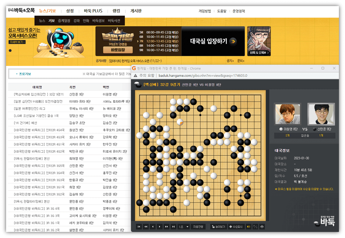 설치가 완료되면 바로 게임이 실행될 텐데요. 사이트를 좀 더 둘러보시는 것도 좋습니다. 특히 뉴스/기보 게시판을 이용해 보면 좋은데요. 최신 바둑 뉴스 기사도 볼 수가 있고요. 프로 기보를 무료로 감상하는 것도 가능하며 중계 일정도 함께 확인해 볼 수 있습니다.